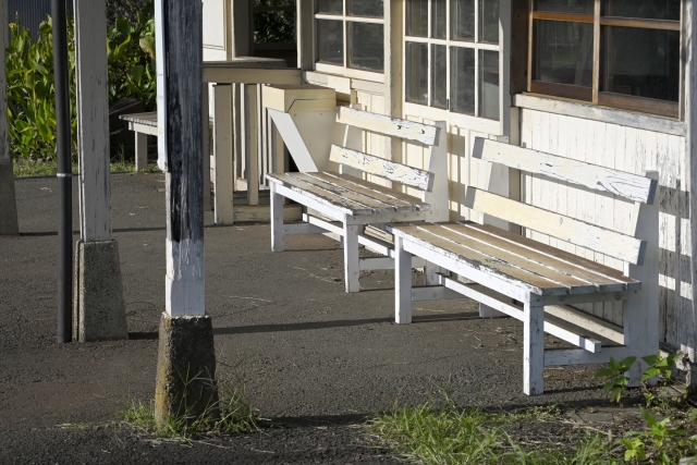 待合室の古い木材の色、窓辺に落ちる影、晴れた日の静けさ。